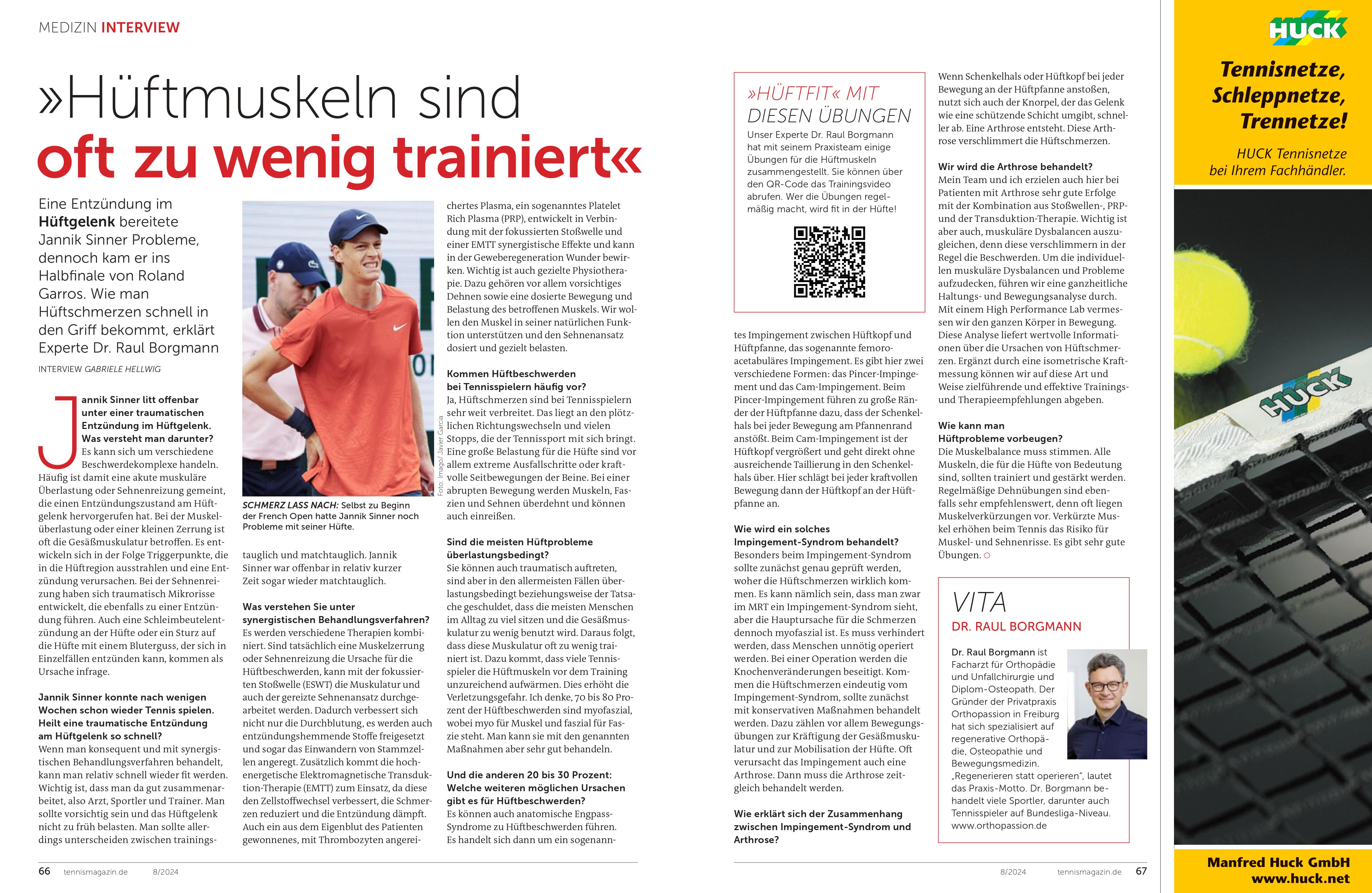 In einem Interview erklärt Dr. Raul Borgmann, wie Hüftbeschwerden bei Sportlern wie Jannik Sinner durch verschiedene Behandlungsmethoden gelindert werden können. Dr. Borgmann betont die Bedeutung der Hüftmuskulatur und erläutert, wie gezielte Übungen und synergistische Behandlungsverfahren, wie Stoßwellen- und Transduktionstherapie, zur Regeneration beitragen. Weitere Details und Trainingsvideos sind über einen QR-Code abrufbar.