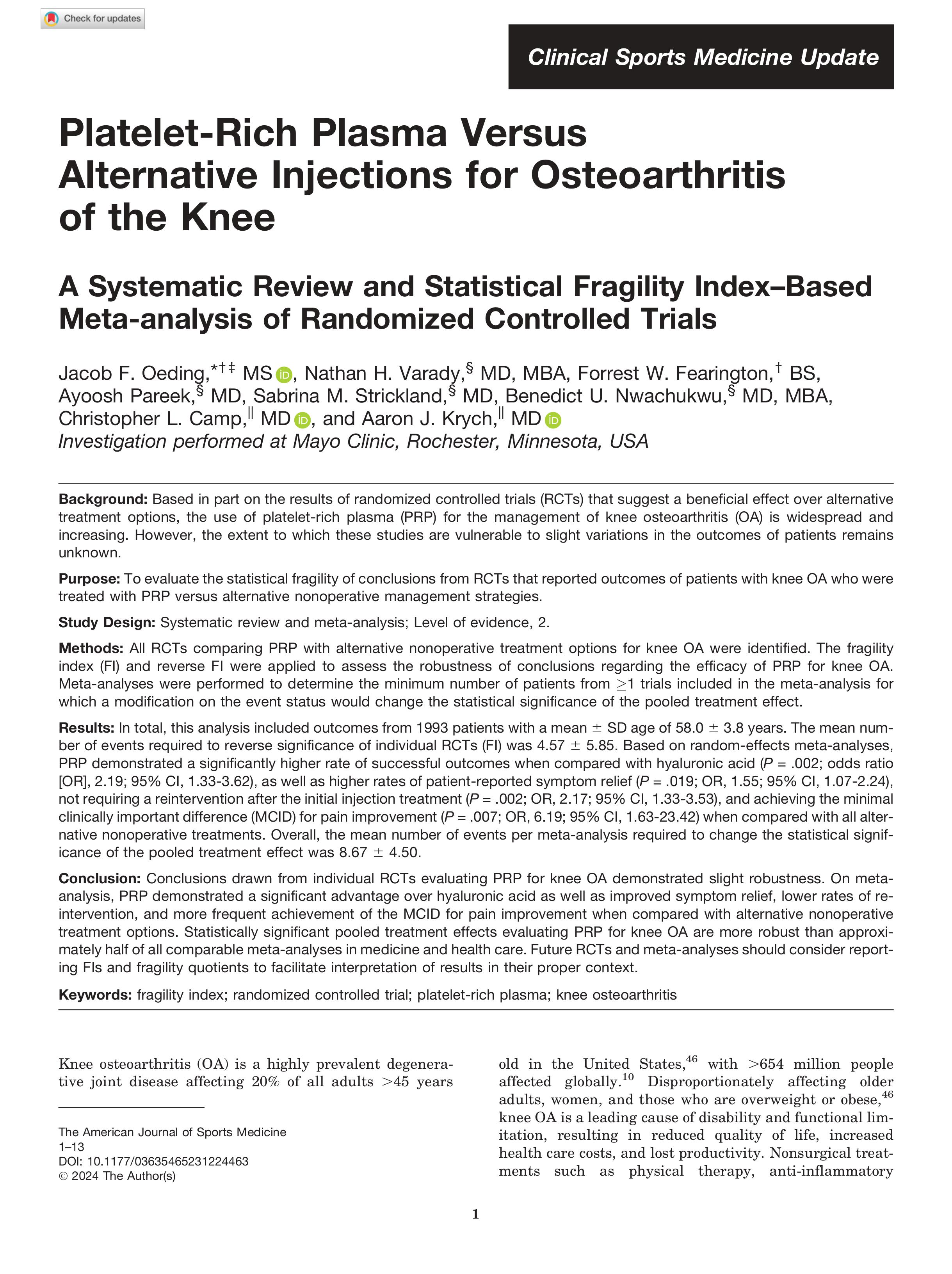 Neue Studie bestätigt: PRP übertrifft andere nicht-operative Behandlungen bei Kniearthrose! 📊 'Platelet-Rich Plasma Versus Alternative Injections for Osteoarthritis of the Knee: A Systematic Review' analysierte 1993 Patienten und fand heraus, dass PRP in Symptomlinderung, geringerer Folgebehandlungsbedarf und Schmerzreduktion effektiver ist als Hyaluronsäure und andere Methoden. Diese Ergebnisse stärken unseren regenerativen Ansatz bei Orthopassion, der Patienten fortschrittliche, evidenzbasierte Therapien bietet.