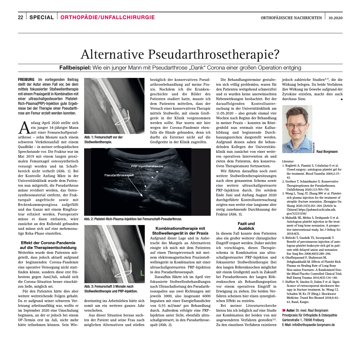 Dans son dernier numéro (octobre 2020), le magazine médical Orthopädische Nachrichten publie un article spécialisé du Dr Raul Borgmann. Il y explique une approche thérapeutique orthopédique qui consiste à donner à un patient atteint de Pseudarthrose par l'utilisation combinée de Ondes de choc (ESWT) und Bioregenerative-Injektionen a pu éviter une intervention chirurgicale importante et très contraignante. En raison de ce succès thérapeutique, le Dr Borgmann préconise d'envisager une telle approche thérapeutique conservatrice avant toute opération, surtout chez les patients souffrant de pseudarthrose des os longs.